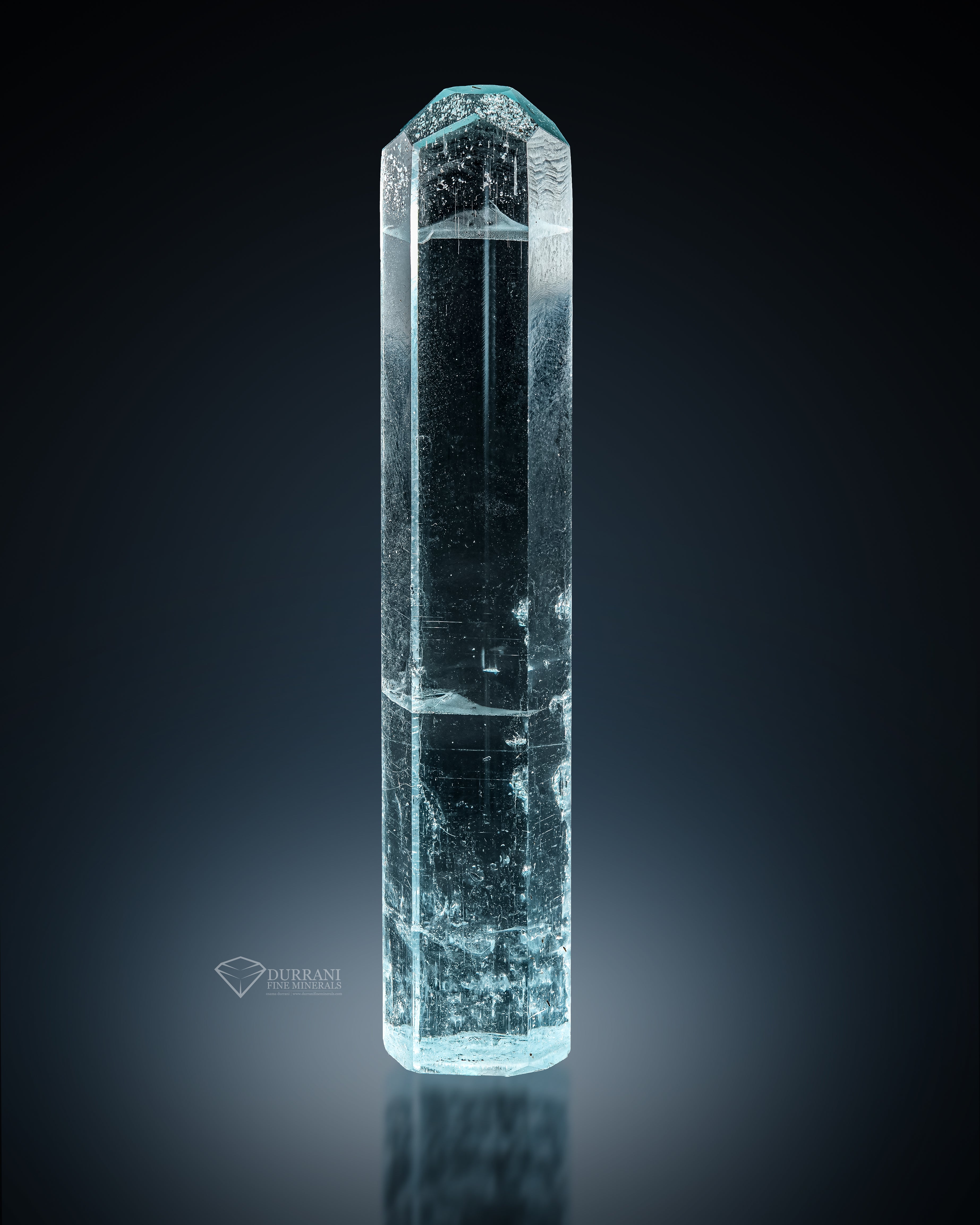 This is a truly stunning aquamarine crystal, doubly terminated and showing a rich, sky-blue color that immediately catches the eye. Its clarity and glassy transparency are exceptional, allowing the light to flow beautifully through the crystal. This is a wonderful crystal of Aquamarine with great clarity. Its sweeping aesthetics, good crystal formation, and excellent condition make it a nice crystal.