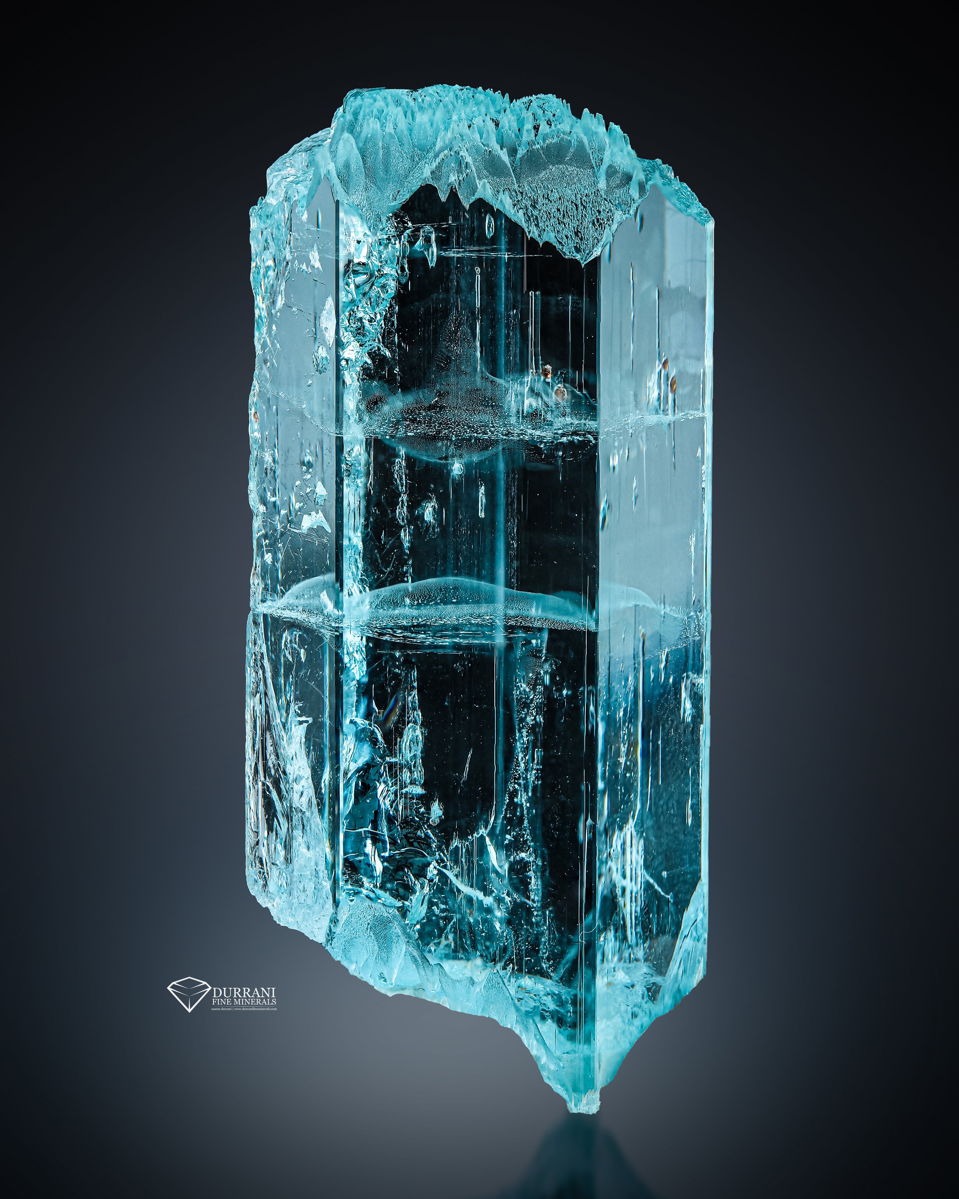 This aquamarine crystal from Shigar Valley, Skardu District, Pakistan, features naturally etched formations on both ends. The etching is the result of geological processes that dissolved parts of the crystal over time, creating intricate surface patterns that enhance its overall character.