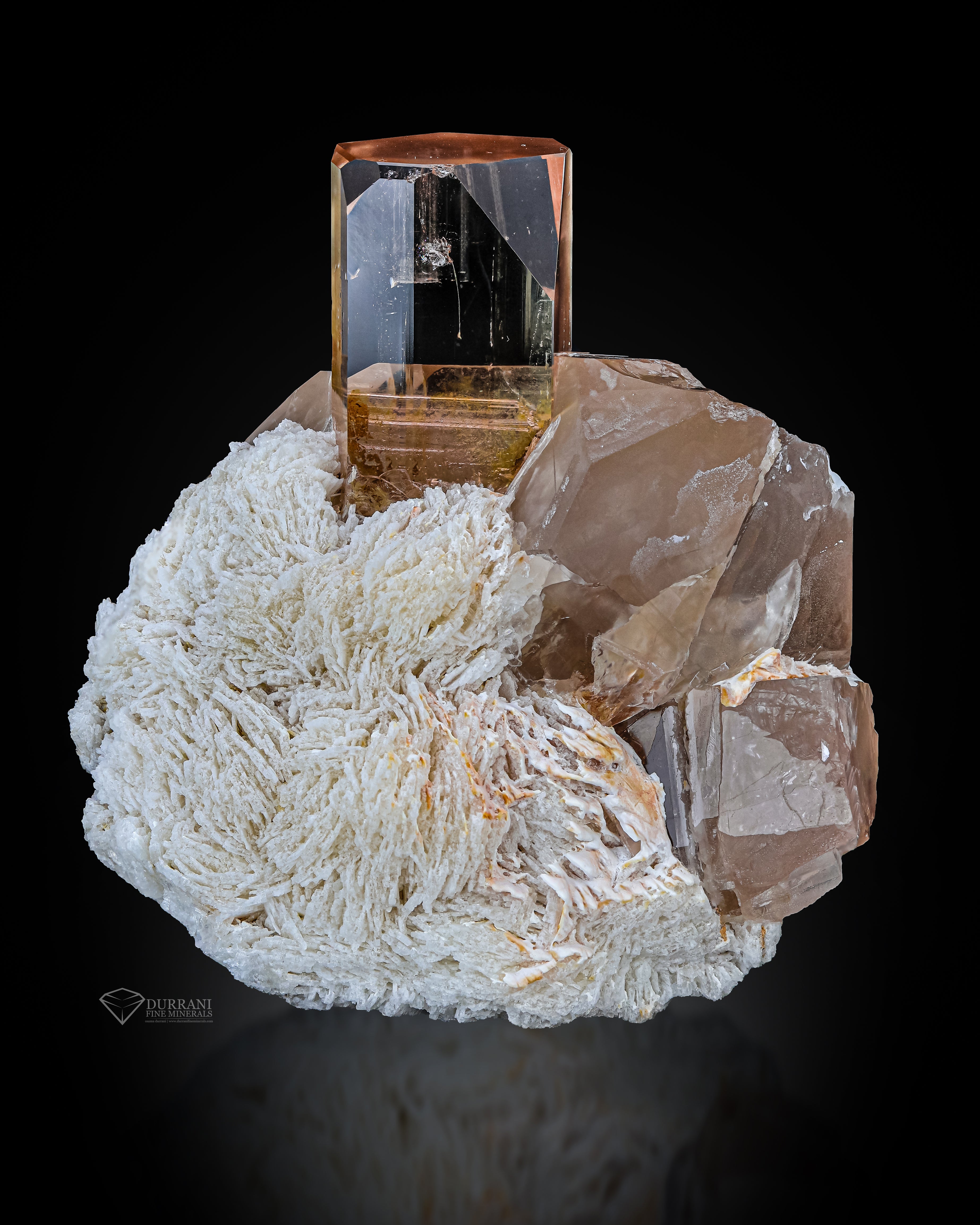 A stunning combination of beautifully clear Topaz crystal with Quartz, gracefully perched on a pristine Albite matrix. This remarkable specimen comes from the famous Shigar Valley, Skardu, Pakistan — a region renowned for producing exceptional mineral specimens . The clarity and luster of these crystals are truly world-class, making this piece a standout addition to any fine collection.