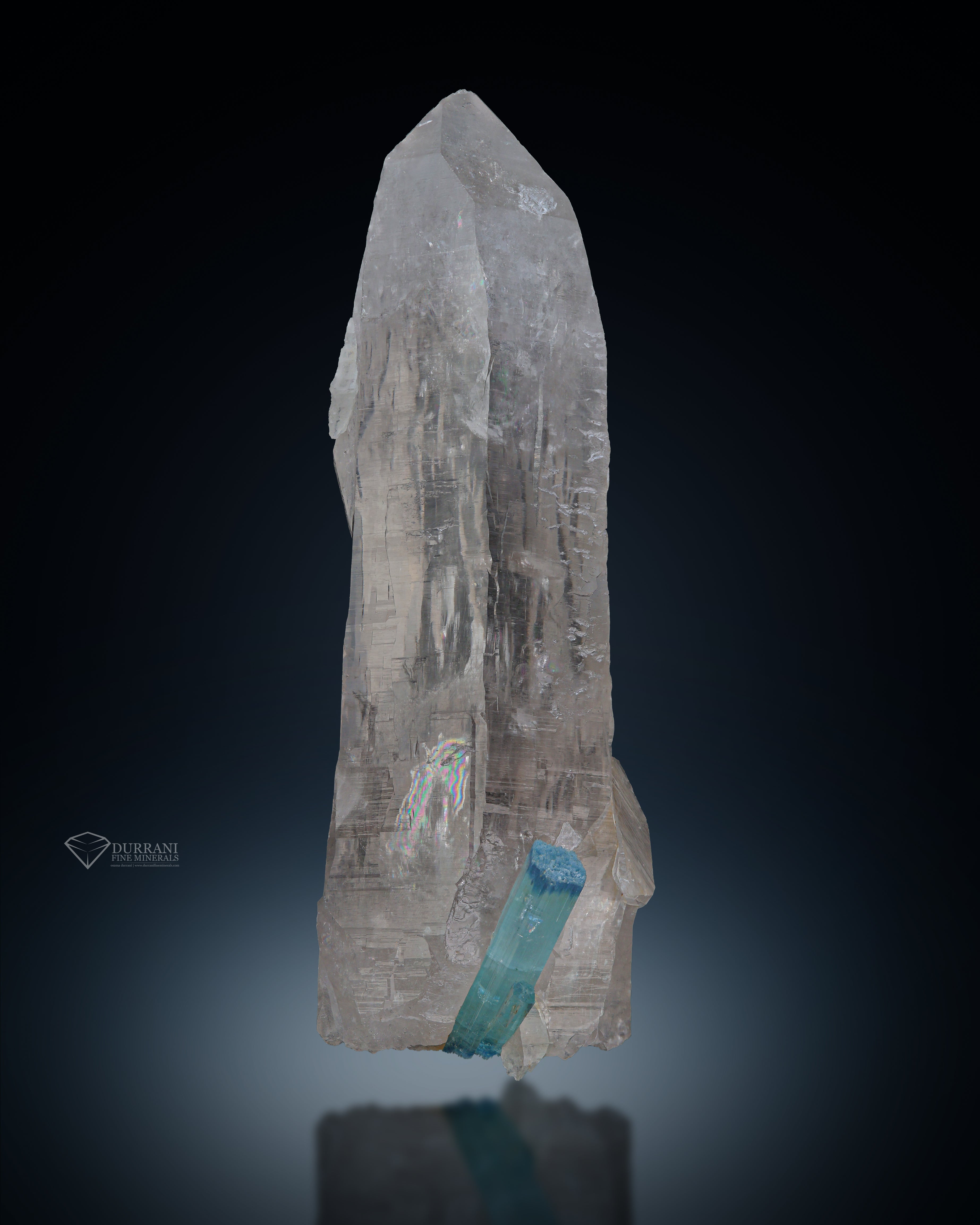 An exceptional specimen featuring a richly saturated blue aquamarine crystal elegantly positioned at bottom a sharply terminated quartz point. Originating from the renowned mineral deposits of Pakistan, this piece exhibits striking contrast, excellent crystal form, and aesthetic balance—making it a standout addition to any fine mineral collection.